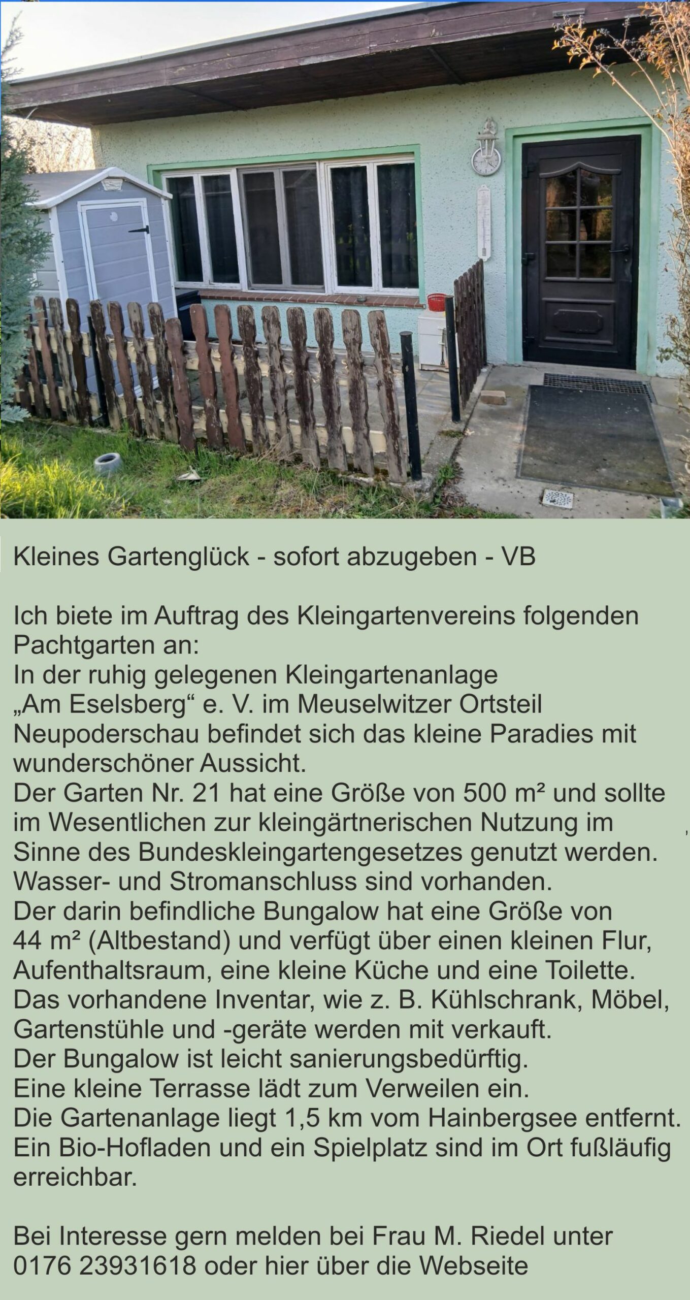 Nach 13 wunderbaren Jahren voller Arbeit, Liebe und unvergesslicher Momente müssen wir uns schweren Herzens von unserem geliebten Garten im Kleingartenverein „Am Eselsberg“ e.V., Schmöllnsche Str. 20a, 04610 Meuselwitz, trennen –