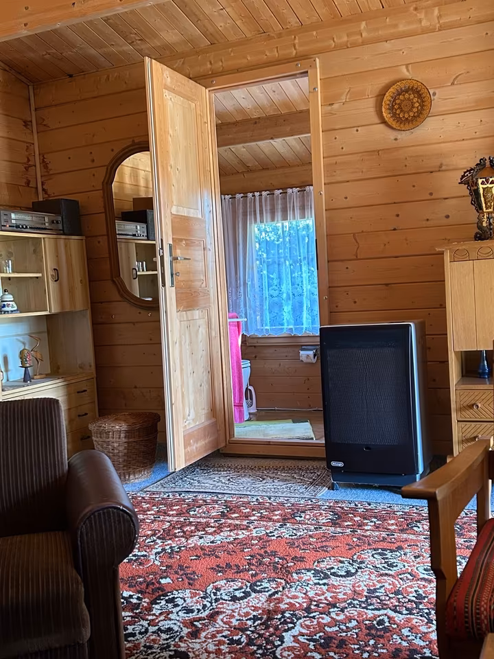 mit Fußbodenheizung, Holzofen, 30 l Warmwasserboiler, Dusche, WC, Küche, Wohnzimmer, Schlafzimmer und gemütlicher Terrasse mit Teich (inklusive Pumpe und Goldfischen)