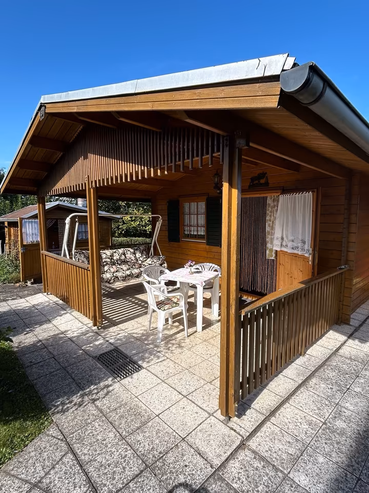 Die davor liegende überdachte Terrasse hat eine Größe von ca. 14 qm. Nebenan steht ein weiteres kleines Holzhaus, in welchem sich jeweils hälftig Küche und Geräteraum befinden.